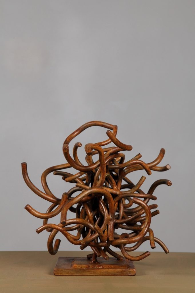 La ligne lui permet de dessiner en trois dimensions avec une grande liberté et de désintégrer la masse. Les blocs massifs ou creux s’apparentent plutôt à la statuaire. Les deux se complètent et se répondent.